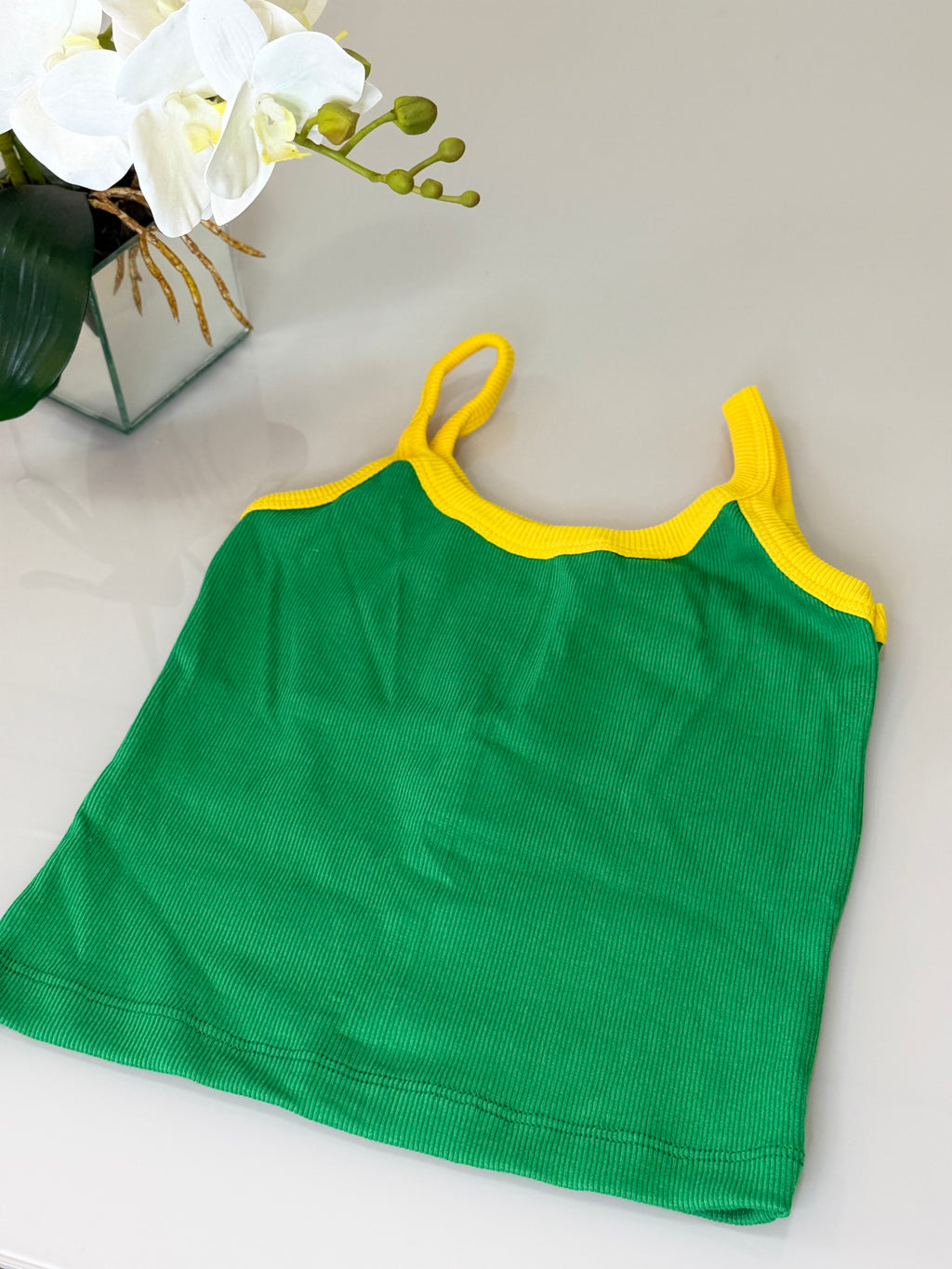 Confeccionada em tecido canelado macio e confortável 🌿, ela se ajusta perfeitamente ao corpo, valorizando a silhueta com muito charme 💛 As alças finas com acabamento em verde trazem um contraste lindo e autêntico 💚